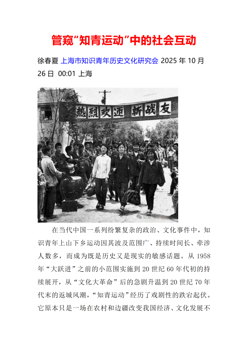 管窥“知青运动”中的社会互动 徐春夏上海市知识青年历史文化研究会2025年10月26日 00:01上海 在当代中国一系列纷繁复杂的政治、文化事件中,知识青年上山下乡运动因其波及范围广、持续时间长、牵涉人数多,而成为既是历史又是现实的敏感话题。从1958年“大跃进”之前的小范围实施到20世纪60年代初的持续展开,从“文化大革命”后的急剧升温到20世纪70年代末的返城风潮,“知青运动”经历