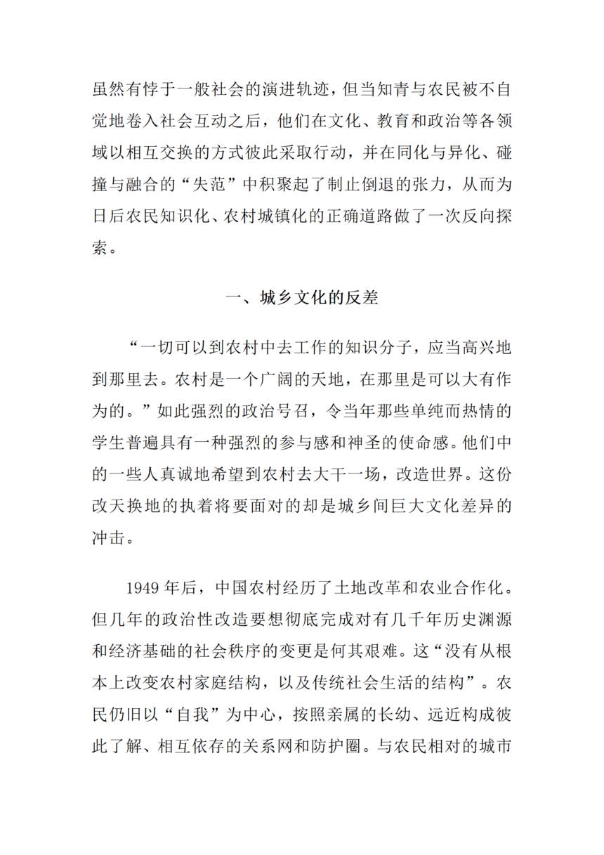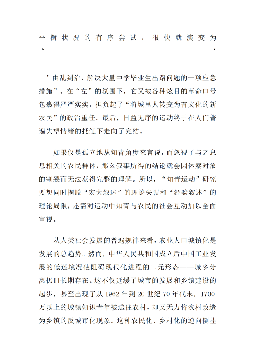 在当代中国一系列纷繁复杂的政治、文化事件中,知识青年上山下乡运动因其波及范围广、持续时间长、牵涉人数多,而成为既是历史又是现实的敏感话题。从1958年“大跃进”之前的小范围实施到20世纪60年代初的持续展开,从“文化大革命”后的急剧升温到20世纪70年代末的返城风潮,“知青运动”经历了戏剧性的跌宕起伏。它原本只是一场在农村和边疆改变我国经济、文化发展不平衡状况的有序尝试,很快就演变为由乱到治,解决大量中学毕业生出路问题的一项应急措施”。在“左”的氛围下,它又被各种炫目的革命口号包裹得严严实实,担负起了“将城里人转变为有文化的新农民”的政治重任。最后,日益无序的运动终于在人们普遍失望情绪的抵触下走向了完结。