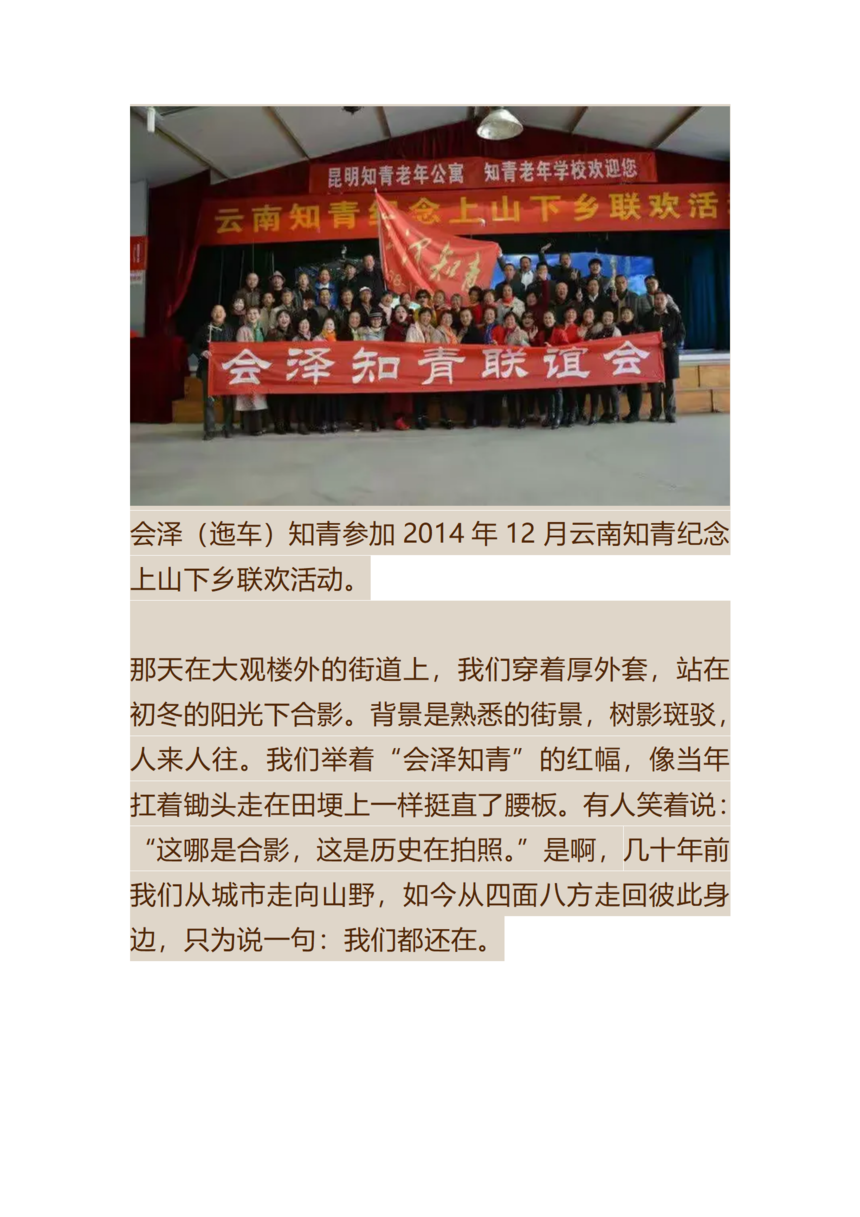 那年的冬天暖得不像话,昆明的风裹着阳光,吹进知青老年公寓的大厅。红底黄字的横幅高高挂起,像一面不褪色的旗帜,写着“云南知青纪念上山下乡联欢活动”。我们从会泽来的这群人,站在一起,手举着“会泽知青联谊会”的横幅,笑得像个孩子。那一刻,仿佛又回到了当年插队的山坡上,风还是那样吹,人却已白了头。可眼神里的光,一点没变。