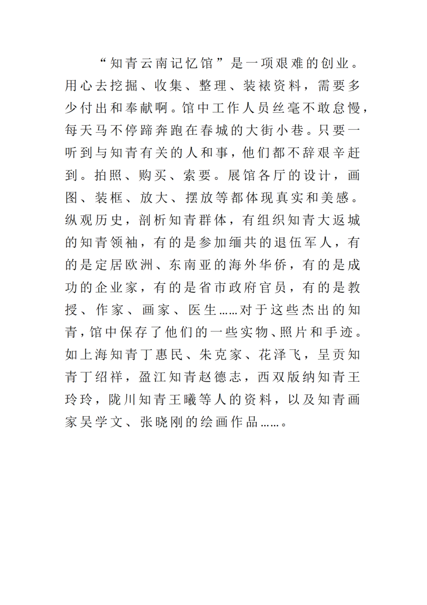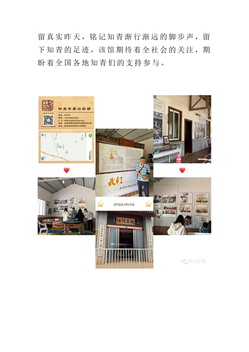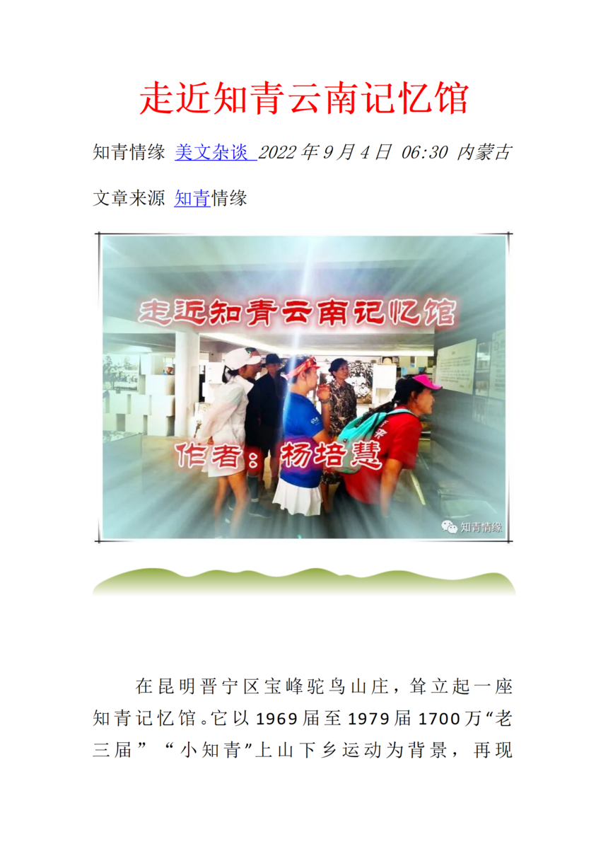 在昆明晋宁区宝峰驼鸟山庄,耸立起一座知青记忆馆。它以1969届至1979届1700万“老三届”“小知青”上山下乡运动为背景,再现了上海、北京、四川、重庆等地老知青在第二故乡西双版纳、瑞丽、耿马、保山、腾冲、芒市、下关、临沧、文山、开远、昆明滇池流域等地区的“小知青”农村生活、劳作等画面,昭示着知青们青春岁月在云南;理想拼搏在乡村的坚韧奋斗精神。