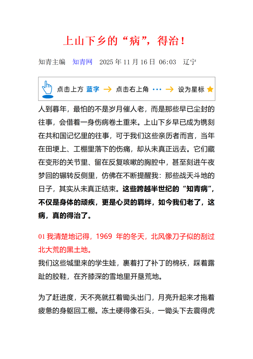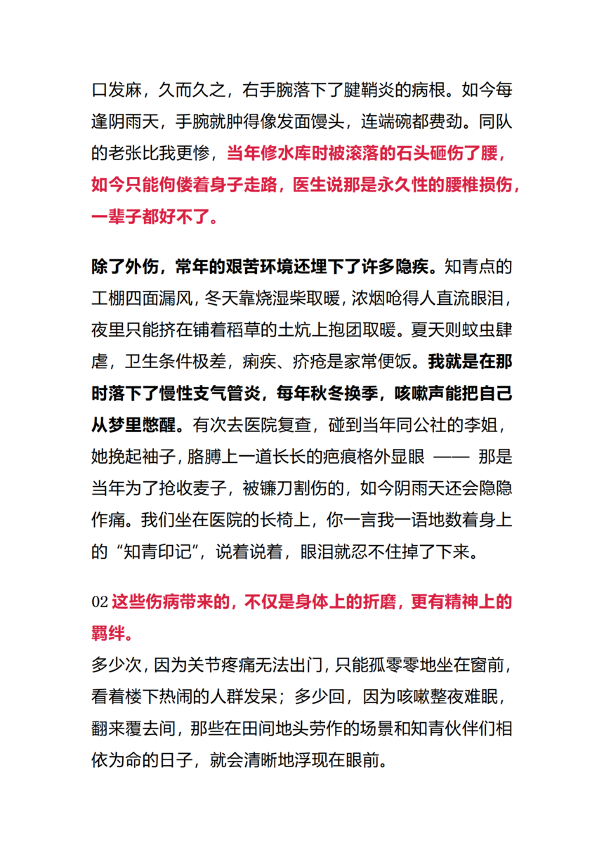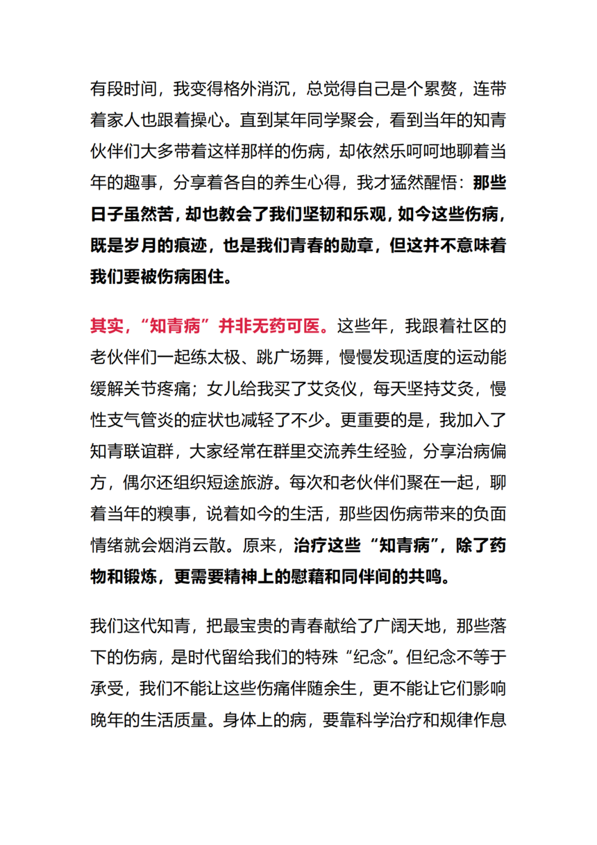 人到暮年,最怕的不是岁月催人老,而是那些早已尘封的往事,会借着一身伤病卷土重来。上山下乡早已成为镌刻在共和国记忆里的往事,可于我们这些亲历者而言,当年在田埂上、工棚里落下的伤痛,却从未真正远去。它们藏在变形的关节里、留在反复咳嗽的胸腔中,甚至刻进午夜梦回的辗转反侧里,仿佛在不断提醒我:那些战天斗地的日子,其实从未真正结束。这些跨越半世纪的 “知青病”,不仅是身体的顽疾,更是心灵的羁绊,如今我们老了,这病,真的得治了。