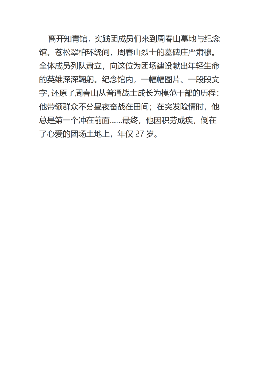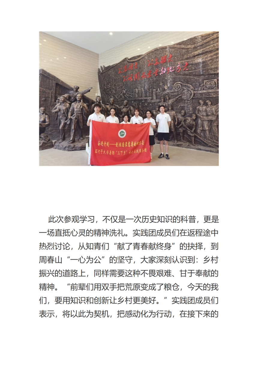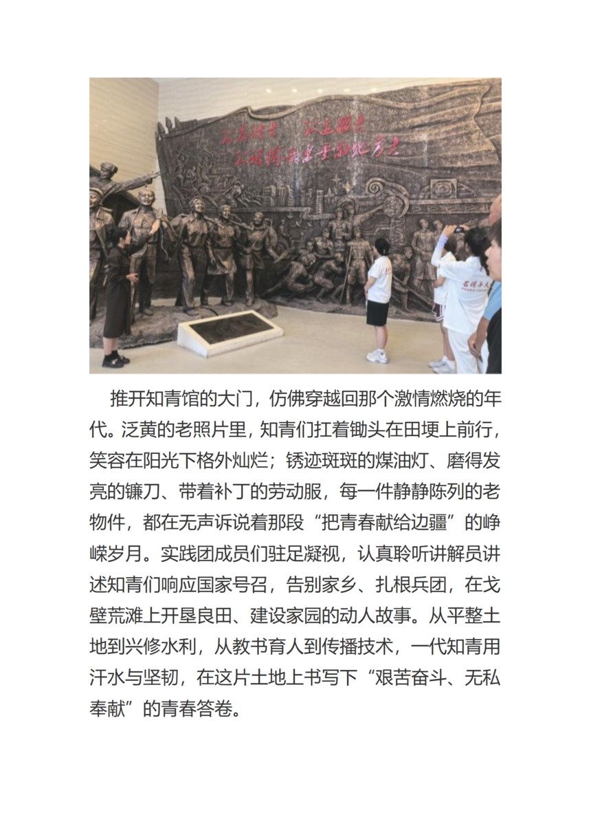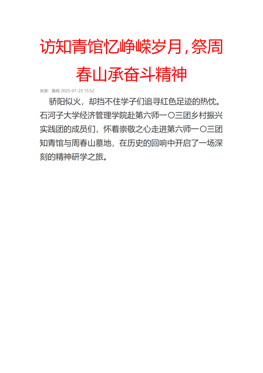 骄阳似火,却挡不住学子们追寻红色足迹的热忱。石河子大学经济管理学院赴第六师一〇三团乡村振兴实践团的成员们,怀着崇敬之心走进第六师一〇三团知青馆与周春山墓地,在历史的回响中开启了一场深刻的精神研学之旅。