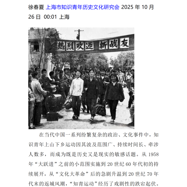 管窥“知青运动”中的社会互动 徐春夏上海市知识青年历史文化研究会2025年10月26日 00:01上海 在当代中国一系列纷繁复杂的政治、文化事件中,知识青年上山下乡运动因其波及范围广、持续时间长、牵涉人数多,而成为既是历史又是现实的敏感话题。从1958年“大跃进”之前的小范围实施到20世纪60年代初的持续展开,从“文化大革命”后的急剧升温到20世纪70年代末的返城风潮,“知青运动”经历
